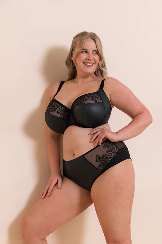 Matching high waist brief to sit with our gorgeous Enchant Bra. Matt pleather high waist brief with floral embroidery panels.